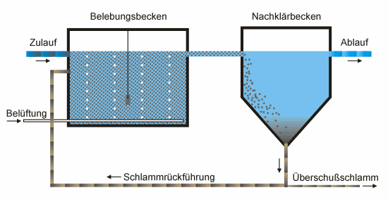 Die aerobe Abwasserreinigung erfolgt in Belebungsbecken durch Mikroorganismen