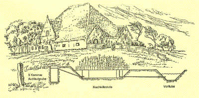 denen sich die Bakterien vorwiegend mit Sauerstoff versorgen. Der Nachteil gegenüber den kompakten Behälteranlagen ist der vergleichsweise hohe Platzbedarf. Je nach Verfahren werden mindestens 2-5 m² Fläche pro Einwohnergleichwert benötigt. Die Mindestfläche eines Pflanzenbeetes wird mit 25 m² angegeben. Um eine große Oberfläche für die zahlreichen Umwandlungsprozesse zur Verfügung zu stellen, ist eine ausreichend tiefe Durchwurzelung notwendig. Rohrschilf zum Beispiel erreicht eine Durchwurzelung bis in 1,20 m Tiefe. Für die meisten Pflanzenkläranlagen ist eine Wurzeltiefe von ca. 60 cm jedoch ausreichend. Typen der PflanzenkläranlagenPflanzenkläranlagen werden in drei Grundtypen unterschieden: 1. in Pflanzenkläranlagen mit wasserüberstauten Beeten 2. in Pflanzenkläranlagen mit nicht bindigem Filtermaterial auf der Basis von sandig-kiesigem Boden. Das Wasser durchströmt den Boden vorwiegend in vertikaler Richtung. 3. in Pflanzenkläranlagen mit bindigem Filtermaterial; hier wird der Bodenkörper horizontal vom Abwasser durchflossen. 4. Mischformen dieser Grundtypen ergeben sich manchmal während des Betriebs oder sind als solche von vornherein geplant. Die mechanische Vorklärrung des Abwassers beim Betrieb von Pflanzenkläranlagen ist sinnvoll, da der Verlauf der anfallenden Abwassermenge gleichmäßiger wird. Darüber hinaus wird die Sedimentation ungelöster Abwasserinhaltsstoffe in der Pflanzenstufe verhindert. Diese mechanische Entschlammung vermeidet zusätzlich eine Verschlechterung der hydraulischen Eigenschaften des Bodenkörpers. Hygiänische Probleme können so vermieden werden. Horizontales VerfahrenDas Abwasser wird über die Mehrkammerabsetzgrube unterhalb der Beetoberfläche in die Anlage eingeleitet. Das Abwasser durchfließt den Bodenkörper und wird auf der Sohle am Ende der Anlage in Filterrohren aufgesammelt und über einen Kontrollschacht in ein Gewässer geleitet oder im Untergrund versickert. Für horizontal durchflossene Anlagen werden mindestens 5 m² Pflanzfläche angesetzt. Bei der Berechnung der notwendigen Fläche müssen der Zu- und Ablaufbereich mitberücksichtigt werden. Vertikales VerfahrenBeim vertikalen System wird das Abwasser über ein Verteil-System auf der Pflanzfläche in den Bodenkörper eingebracht. Das Wasser wird gleichmäßig über die gesamte Pflanzfläche verteilt und rieselt aus den Verteilerrohren in den Bodenkörper. Auf der Sohle der Anlage wird das gereinigte Wasser gesammelt und ebenfalls über einen Kontrollschacht in ein Gewässer geführt oder im Untergrund verrieselt. Betriebshinweise